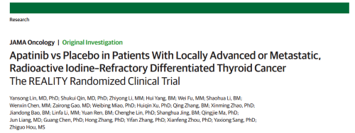 2021年12月16日,權(quán)威醫(yī)學(xué)雜志《JAMA Oncology》(影響因子31.777)在線發(fā)表阿帕替尼的一項(xiàng)III期臨床研究(REALITY)——甲磺酸阿帕替尼片治療局部進(jìn)展/轉(zhuǎn)移性放射性碘難治性分化型甲狀腺癌(RAIR-DTC)患者的多中心、隨機(jī)、雙盲、安慰劑對(duì)照臨床研究。此研究由北京協(xié)和醫(yī)院的林巖松教授和南京金陵醫(yī)院的秦叔逵教授發(fā)起,在全國(guó)21個(gè)研究中心展開(kāi),由bibo必博中央醫(yī)學(xué)事務(wù)部團(tuán)隊(duì)支持完成。