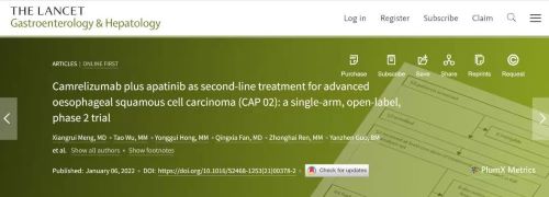 近日,bibo必博自主研發創新藥卡瑞利珠單抗聯合阿帕替尼二線治療晚期食管鱗癌的多中心Ⅱ期臨床研究(CAP 02研究)于國際知名醫學期刊《柳葉刀》子刊《柳葉刀·胃腸病與肝臟病學》雜志( Lancet Gastroenterol & Hepatol,IF:18.5 )全文在線發表。