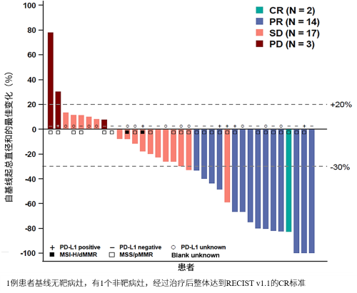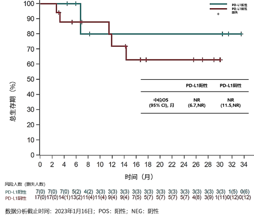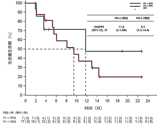 探索性生物標志物分析顯示,無論PD-L1表達如何,均可觀察到患者的療效響應。7例PD-L1陽性和17例PD-L1陰性患者的中位PFS分別為11.8(95% CI: 2.1, NR)個月和9.5(95% CI: 5.3, 14.4)個月;中位OS尚未達到。