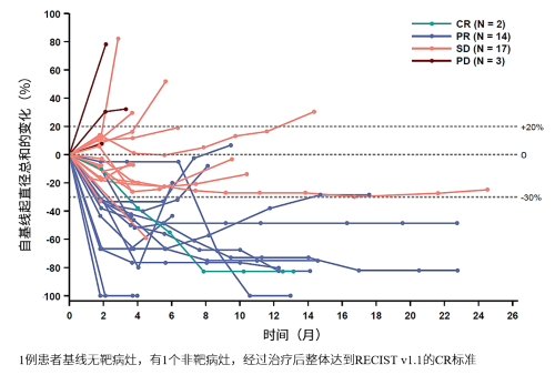 36例患者中,有13例(36.1%)在第1次影像學評估時即發生應答。截至本次數據分析,7例患者仍在接受治療。