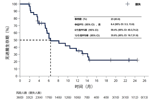 患者入組時間為2020年1月至2022年10月。截至2023年1月16日[1]。中位隨訪時間為14.0個月(IQR: 6.3, 23.3),36例療效可評估人群中,確認的客觀緩解率(ORR)為44.4%(95% CI: 27.9%, 61.9%),其中2例患者達到完全緩解(CR),14例患者達到部分緩解(PR),17例患者達到疾病穩定(SD),確認的疾病控制率(DCR)為91.7%(95% CI: 77.5%,98.2%)。