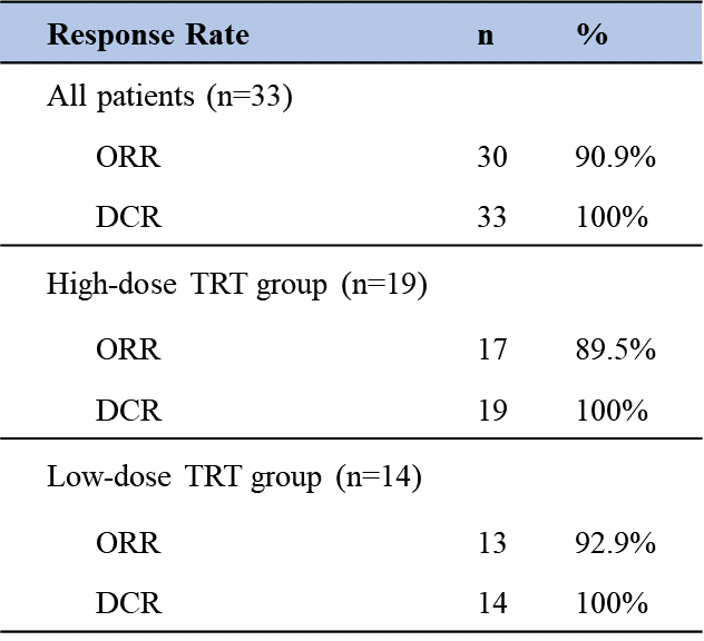 在33例患者中,19例患者接受高劑量TRT(>3Gy*10f或≥2Gy*25f),14例患者接受低劑量TRT(≤3Gy*10f或<2Gy*25f)。阿得貝利單抗聯合化療序貫胸部放療一線治療廣泛期小細胞肺癌患者顯示出良好的數據:ORR達90.9%,這意味著10個ES-SCLC患者中就有9個患者可以獲得疾病客觀緩解。DCR達100%。根據目前公布的研究數據,接受高劑量TRT組的患者和接受低劑量TRT組的患者療效上沒有顯著差異,ORR分別為89.5%和92.9%;DCR都可達100%。