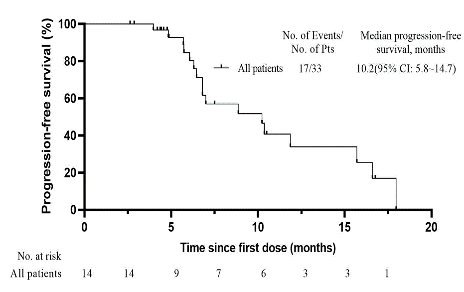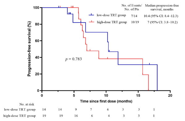 中位隨訪時間13個月,研究結果顯示,17例患者出現疾病進展,中位PFS達10.2個月(95% CI:5.8-14.7);高劑量TRT(>3Gy*10f或≥2Gy*25f)組中位PFS為7個月,低劑量TRT(≤3Gy*10f或<2Gy*25f)組中位PFS高達10.4個月,提示低劑量TRT聯合免疫治療可能為ES-SCLC患者帶來進一步獲益的趨勢,但仍然需要大型Ⅲ期臨床研究進一步驗證。