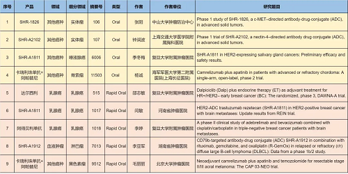 涉及的創(chuàng)新藥包括6款已上市創(chuàng)新產(chǎn)品:注射用卡瑞利珠單抗(艾瑞卡?)、甲磺酸阿帕替尼片(艾坦?)、馬來酸吡咯替尼片(艾瑞妮?)、羥乙磺酸達爾西利片(艾瑞康?)、阿得貝利單抗注射液(艾瑞利?)、氟唑帕利膠囊(艾瑞頤?),以及9款未上市創(chuàng)新產(chǎn)品:抗PD-L1/TGF-βRII雙抗瑞拉芙普-α(SHR-1701)、多靶點受體酪氨酸激酶抑制劑法米替尼、IL-15融合蛋白SHR-1501、雙特異性抗體SHR-2017、全人源抗CTLA-4單克隆抗體SHR-8068、抗體偶聯(lián)藥物(ADC)瑞康曲妥珠單抗(SHR-A1811)、SHR-1826、SHR-A1912、SHR-A2102。2類新藥鹽酸伊立替康脂質體注射液(II)(越優(yōu)力?)及國內首仿藥昂丹司瓊口溶膜(艾其速?)各有1項研究入選。