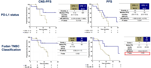 本研究引入了三陰性乳腺癌“復旦分型”,根據分型顯示,在免疫調節型(IM型)中,CNS-PFS尚未達到,在非免疫調節型(Non-IM型)中,CNS-PFS為10個月;整體PFS在免疫調節型(IM型)和非免疫調節型(Non-IM型)展示出明顯差異,PFS分別為19個月和6.1個月。