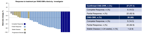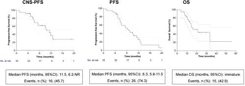 中位隨訪時間為17.5個月,確認的CNS-ORR為77.1%(27/35),確認的CNS-CBR為80%(28/35),CNS-PFS為11.5個月(6.2-NR),整體mPFS為8.3個月(5.8-11.5),中位OS尚不成熟。