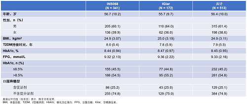 研究共入組513例中國成人T2DM受試者,INS068組和IGlar組分別入組341例和172例。
