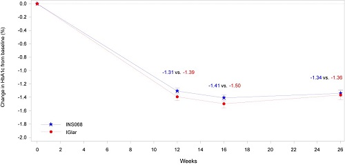 本研究達到預設的主要終點,治療26周后,INS068組的HbA1c相對基線變化非劣于IGlar組。INS068組與IGlar組的HbA1c降幅分別為0.70%和0.83%,兩組差值為 0.13%(95% CI:-0.05,0.31)。