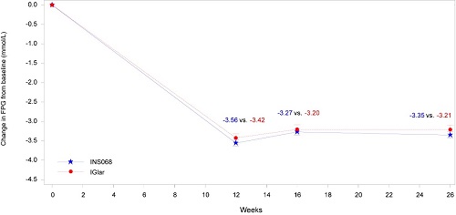 治療26周后,INS068組FPG降幅大于IGlar組(均值變化:-2.40 mmol/L vs -1.96 mmol/L;兩組差值:-0.45 mmol/L,95% CI:-0.74,-0.16)。