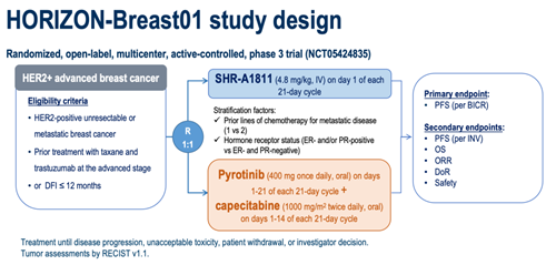 本次大會,研究者報告了Ⅲ期HORIZON-Breast01研究(瑞康曲妥珠單抗 vs 吡咯替尼+卡培他濱治療曲妥珠單抗和紫杉烷經治的HER2陽性晚期乳腺癌)期中分析的主要統計分析結果。