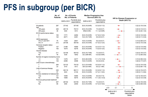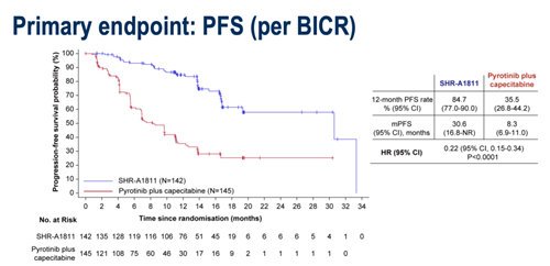 研究達到了主要終點。BICR評估的中位PFS方面,瑞康曲妥珠單抗組達到30.6個月(95%CI:16.8-NR),吡咯替尼聯合卡培他濱組為8.3個月(95%CI:6.9-11.0)。HR=0.22(95%CI:0.15-0.34,P<0.0001)。