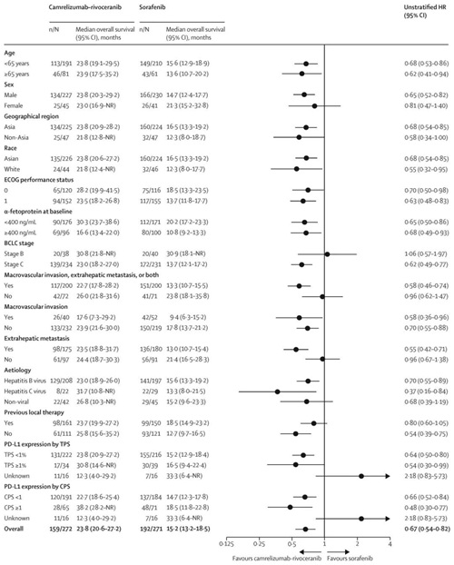 截至2023年6月14日,最終分析結果顯示,卡瑞利珠單抗聯(lián)合阿帕替尼組的中位OS為23.8個月(95% CI:20.6-27.2個月),索拉非尼組為15.2個月(95% CI:13.2-18.5個月);HR=0.64(95% CI:0.52-0.79),P<0.0001。OS曲線圖及亞組分析結果詳見下圖。