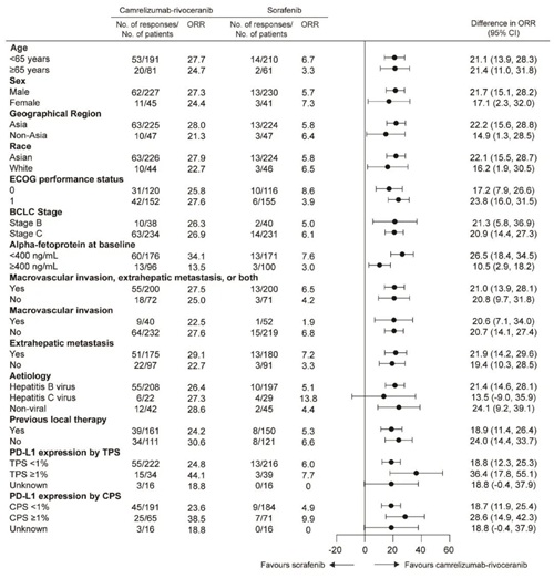 最終分析時,BIRC依據RECIST 1.1標準評估的結果顯示,“雙艾”方案組的客觀緩解率(ORR)優(yōu)于索拉非尼組(27%[73/272] vs. 6%[16/271]),兩組差異為21%(95% CI:15%-27%)。此外,“雙艾”方案組的中位至緩解時間(TTR)更短(1.9個月 vs. 3.7個月)。該ORR獲益在絕大多數預設亞組中均保持一致,詳見下圖。